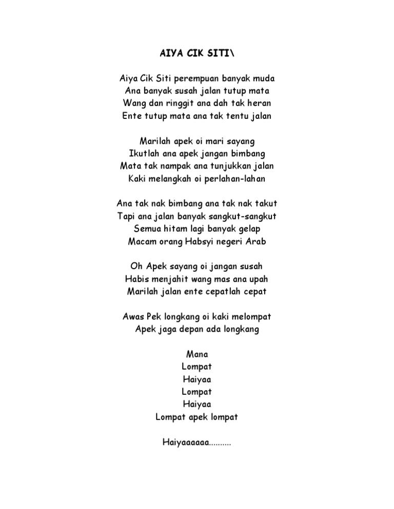 Sedutan lagu Aiya Cik Siti dari episod Kenangan Mengusik Jiwa-----Subscribe to our Youtube channel. Marilah apek oi mari sayang Ikutlah ana apek jangan bimbang Mata tak nampak ana tunjukkan jalan Kaki melangkah oi perlahan-lahan. Lyrics for Ai Ya Cik Siti by Ismail Haron feat.